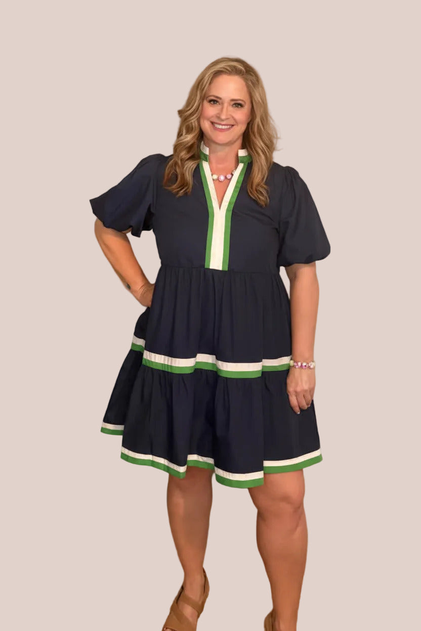 This is a very cute dress for spring and summer. It would be flattering on any body style. It has a solid round v-neck with bubble sleeves and an accented mutlicolor band. Other features include pockets at side and it is lined and lightweight.